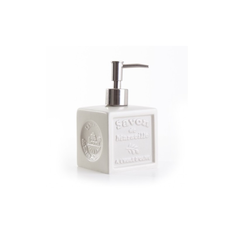 Ceramic liquid soap dispenser in the shape of a Marseille soap cube. Equipped with a brushed aluminum color pump, it can contain 300ml of liquid Marseille soap. Ideal for a combination with our 1 liter liquid soaps. Sold empty, without soap inside. Available in sky blue, green, ivory, taupe, black and purple.