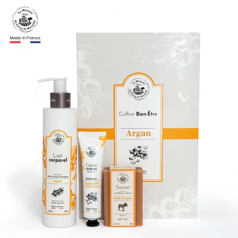Votre coffret contient :- Une crème main de voyage 30ml- Un savon au lait frais biologique d'ânesse enrichi en huile d'Argan- Un lait corporel 250ml enrichi à l'huile d'Argan Bio