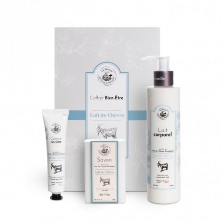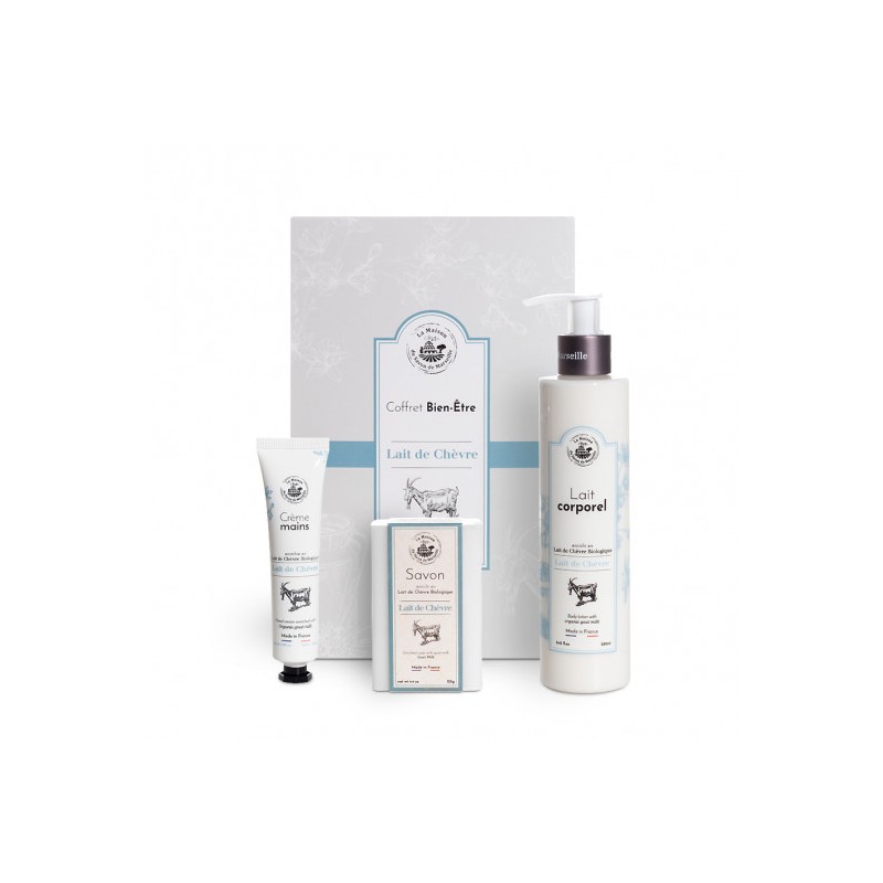 Le coffret Trio, le coffret qu'il vous faut ! La fragrance Lait de Chèvre est à la fois florale et veloutée. Le lait de Chèvre permet une hydratation intense sur votre peau.Votre coffret contient :- Une crème main de voyage 30ml- Un savon au lait frais biologique de Chèvre - Un lait corporel 250ml au Lait de Chèvre Bio