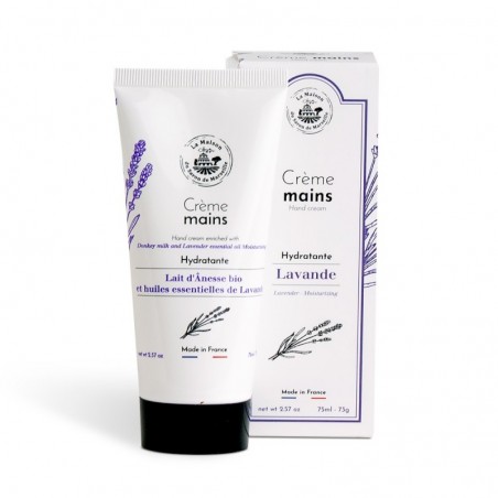 La crème mains, 75ml, enrichie au lait d'ânesse et huiles essentielles de lavande est conseillée pour les mains sèches. L’huile d’argan est un petit miracle pour la peau grâce à ses propriétés anti-âge. Elle aide à lutter contre le vieillissement prématuré de la peau. Cette crème main a des vertus restructurantes pour une peau adoucie, lisse et hydratée. Le lait d’ânesse est un ingrédient aux multiples vertus et propriétés thérapeutiques. On en retire 3 propriétés importantes : il contient de nombreux minéraux, acides gras essentiels, bonnes pour la peau. Il retend l'épiderme, ce qui le rend plus ferme dès les premières applications. Il régénère les zones de l'épiderme irritées par les attaques du quotidien ou abîmées. Toutes nos crèmes mains sont faites en France.