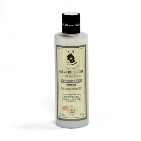 Une formule crémeuse enrichie au lait d'ânesse pour le soin de la peau, en extrait de beurre de karité pour la nourrir et l'assouplir et en glycérine végétale pour maintenir son hydratation. La crème de douche est une alternative pour combiner les propriétés d'un gel de douche nettoyant et une légère hydratation d'un lait corporel.