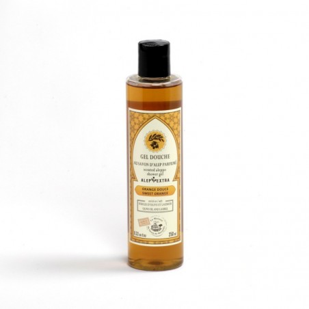 Ce gel douche d'alep liquide parfumé est revisité avec des huiles essentielles d'orange douce. Ce savon nourrit, hydrate et protège la peau en associant les bienfaits de l'huile de laurier et de l'huile d'olive Votre savon d'Alep liquide ne déssèche pas la peau. On peut l'utiliser en shampoing notamment comme anti-pelliculaire. Tout comme le savon d'Alep solide, le savon d'Alep liquide a des propriétés purifiantes et antiseptiques et conviendra parfaitement aux peaux sensibles ou aux peaux à problèmes (rougeurs, irritations ...). Contenance du produit: 250ml